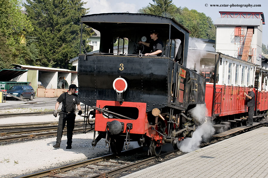 Steam locomotive No. 3 of the Achensee Bahn pulls into the station at Jenbach, Austria.