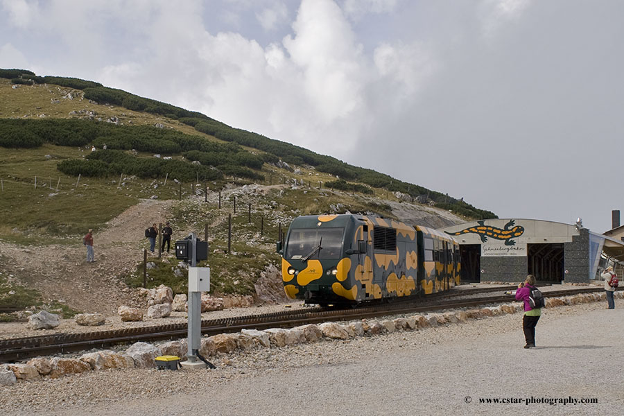 Schneebergbahn train (Salamander) leaving the Hochschneeberg summit, Austria