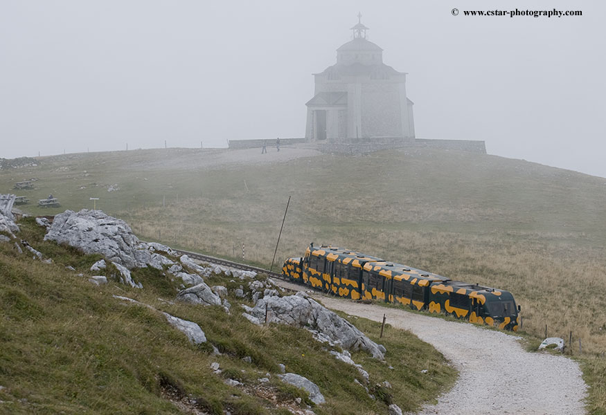 The Schneebergbahn cog-wheel train climbs through the mist to the summit of Hochschneeberg, in Austria.