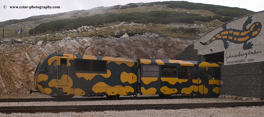 Schneebergbahn train (Salamander) leaving the Hochschneeberg summit, Austria