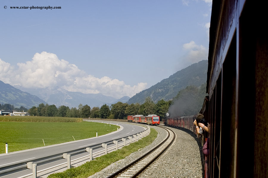 Steam locomotive no. 5 "Gerlos" passing a Zillertalbahn diesel train