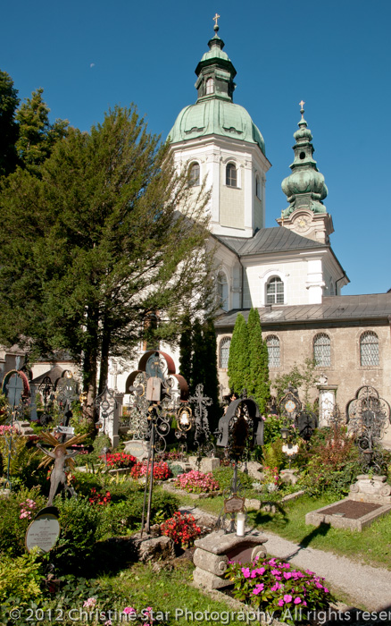 Beautifully tended graves in St. Peter's Cemetery with St. Peter's Abbey Church in the background, Salzburg