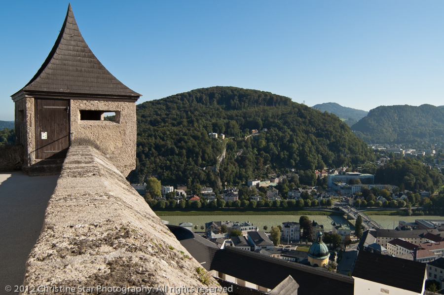 Castle wall with lookout looking over Salzach river toward the town and mountains, Salzburg