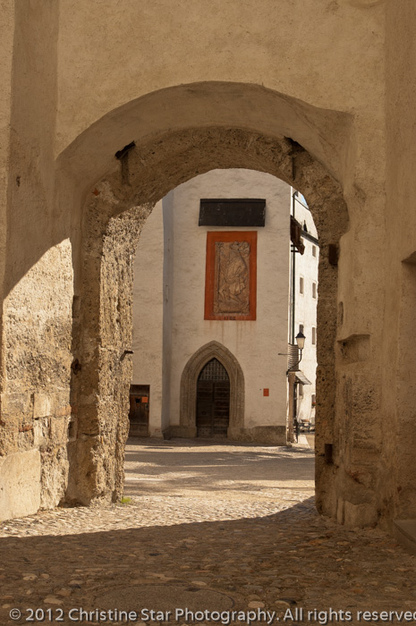 Looking through stone gate into the inner courtyard toward St. George’s Church, Hohensalzburg Castle, Salzburg