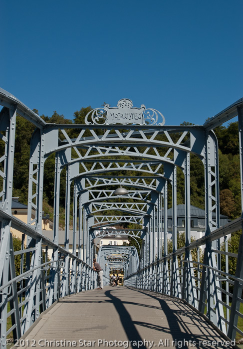 Mozartsteg bridge, a pedestrian bridge, over the river Salzach in Salzburg